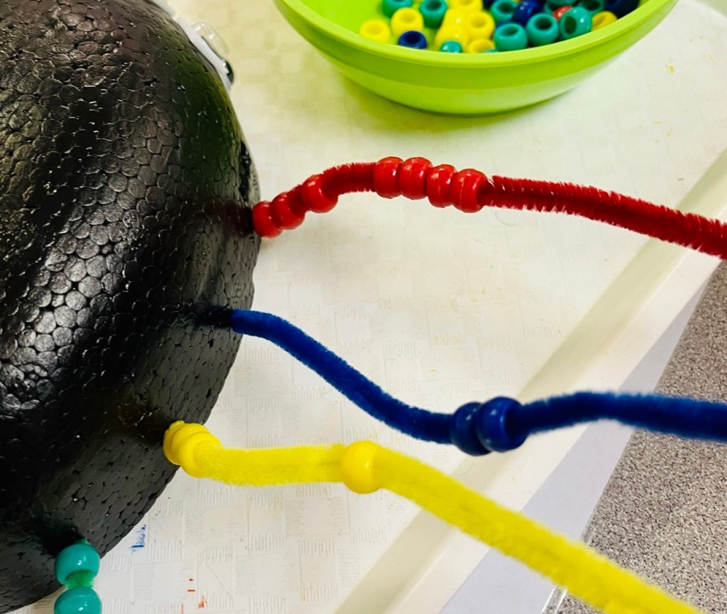 - Allow your toddler to thread the beads onto the pipe cleaners to create colorful spider legs.