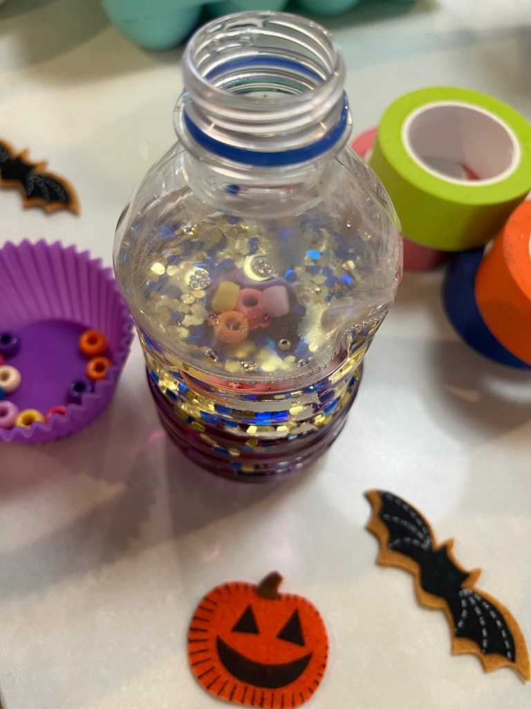 Now add in your beads and glitter. Tightly screw on your cap and wrap several layers of washi tape on top to securely seal the liquid mixture inside. Then place your Halloween stickers on the outside of the bottle to decorate.
