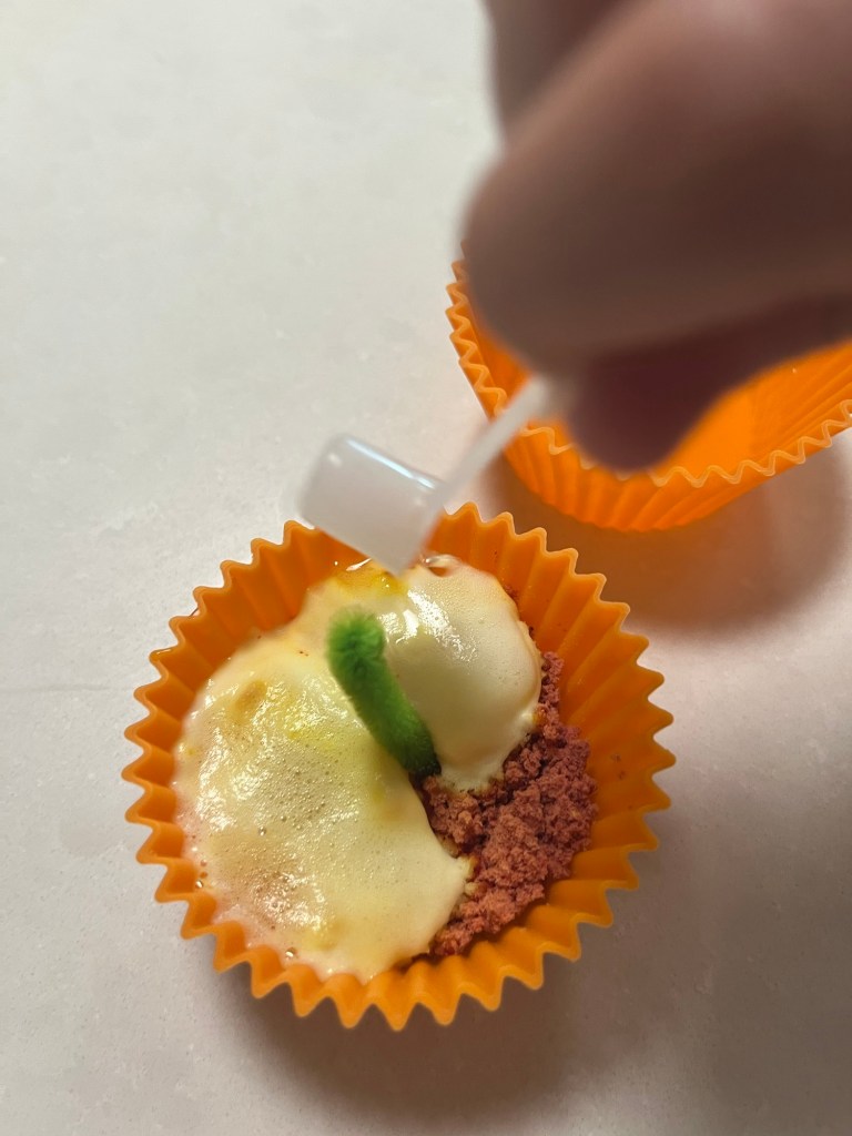 Fill one bowl 3/4ths of the way with baking soda and add about 8 drops of orange food dye and mix. Now take your scissors and cut your green pipe cleaner a little longer than your bowl. This will act as the stem of your pumpkin. Place this in the center of the bowl.