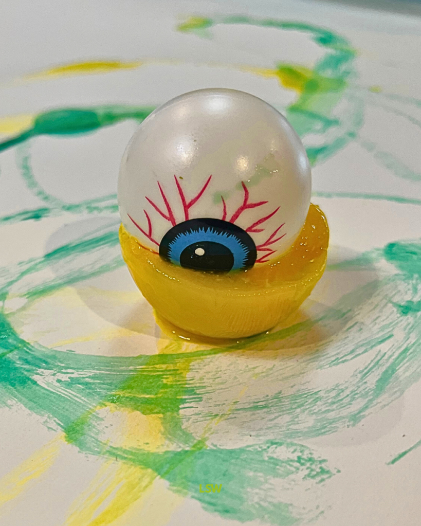 First pour water into sphere ice tray. Next add paint and mix. Drop your eyeball into the paint/water mixture. Place in freezer until frozen.