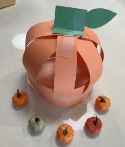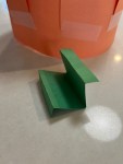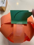 Cut put a green rectangle same width as your strips. fold in half. Now fold the end down. Tape the base of the stem to the top strip of the pumpkin. Next cut out a leaf shape and tape to the stem.