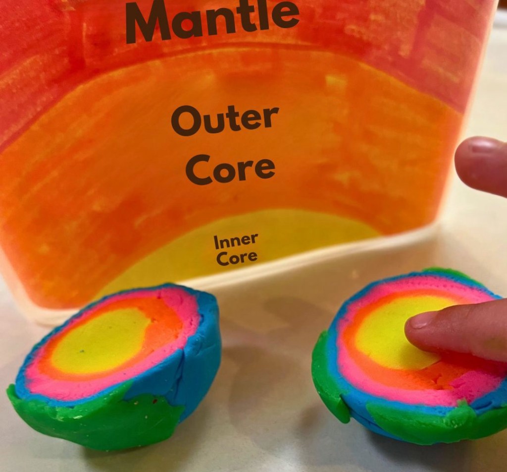 With adult help, have the child slice through the play-doh earth down the middle to reveal the hidden layers underneath